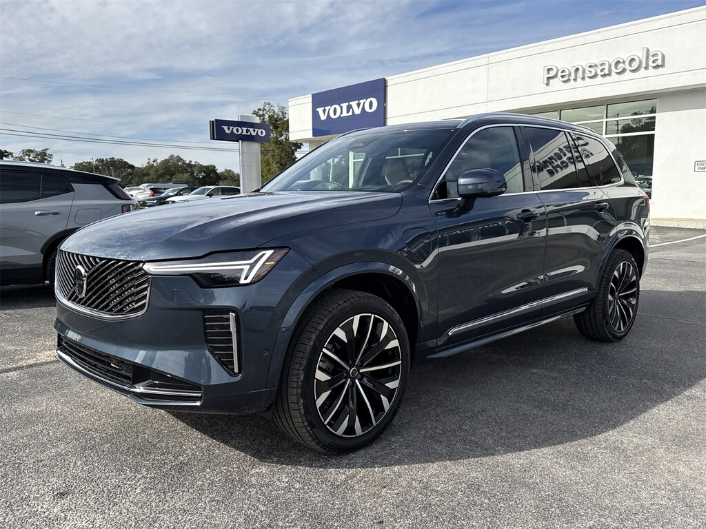 Blue 2026 Volvo XC90 Plug-In Hybrid T8 Ultra 7 Passenger AWD Automatic with Geartronic 2.0L I4 Hybrid Turbocharged DOHC 16V LEV3-SULEV30 2.0L I4 Hybrid Turbocharged DOHC 16V LEV3-SULEV30, 14 Speakers, 3rd row seats: bucket, 4-Wheel Disc Brakes, ABS brakes, Air Conditioning, Alloy wheels, AM/FM radio: SiriusXM, Anti-whiplash front head restraints, Apple CarPlay, Auto High-beam Headlights, Auto-dimming door mirrors, Auto-dimming Rear-View mirror, Automatic temperature control, Brake assist, Bumpers: body-color, Delay-off headlights, Driver door bin, Driver vanity mirror, Dual front impact airbags, Dual front side impact airbags, Electronic Stability Control, Emergency communication system: Volvo Cars App w/4 Year Subscription, Exterior Parking Camera Rear, Four wheel independent suspension, Front anti-roll bar, Front Bucket Seats, Front Center Armrest w/Storage, Front dual zone A/C, Front reading lights, Fully automatic headlights, Garage door transmitter: HomeLink, Genuine wood dashboard insert, Genuine wood door panel insert, harman/kardon® Speakers, Headlight cleaning, Heads-Up Display, Heated door mirrors, Heated Front Bucket Seats w/Power Side Support, Heated front seats, Heated rear seats, Heated steering wheel, Illuminated entry, Integrated rear child seats, Knee airbag, Low tire pressure warning, Memory seat, Navigation System, Occupant sensing airbag, Outside temperature display, Overhead airbag, Panic alarm, Passenger door bin, Passenger vanity mirror, Power door mirrors, Power driver seat, Power Liftgate, Power moonroof, Power passenger seat, Power steering, Power windows, Radio data system, Radio: High Performance Audio System, Rain sensing wipers, Rear air conditioning, Rear anti-roll bar, Rear dual zone A/C, Rear fog lights, Rear reading lights, Rear seat center armrest, Rear window defroster, Rear window wiper, Remote keyless entry, Security system, Speed control, Speed-sensing steering, Split folding rear seat, Spoiler, Steering wheel mounted audio controls, Tachometer, Telescoping steering wheel, Traction control, Trip computer, Turn signal indicator mirrors, Variably intermittent wipers, Ventilated front seats, Ventilated Nappa Leather Upholstery, and Wheels: 21" 5-Multi Spoke Black Diamond Cut Alloy. 2.0L I4 Hybrid Turbocharged DOHC 16V LEV3-SULEV30.